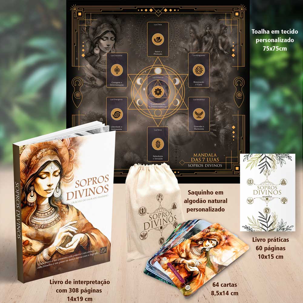 O Oráculo Sopros Divinos é composto de 64 cartas ilustradas a mão, impressas em papel especial de alta gramatura, e livro de interpretação com 314 páginas. O livro traz ainda a Mandala das 7 Luas, ferramenta única desenvolvida para aprofundamento terapêutico. A Mandala faz a conexão entre os 7 grupos de arquétipos do oráculo, relacionando-os com as fases da Lua e apresentando proposições para o mergulho de autoconhecimento.